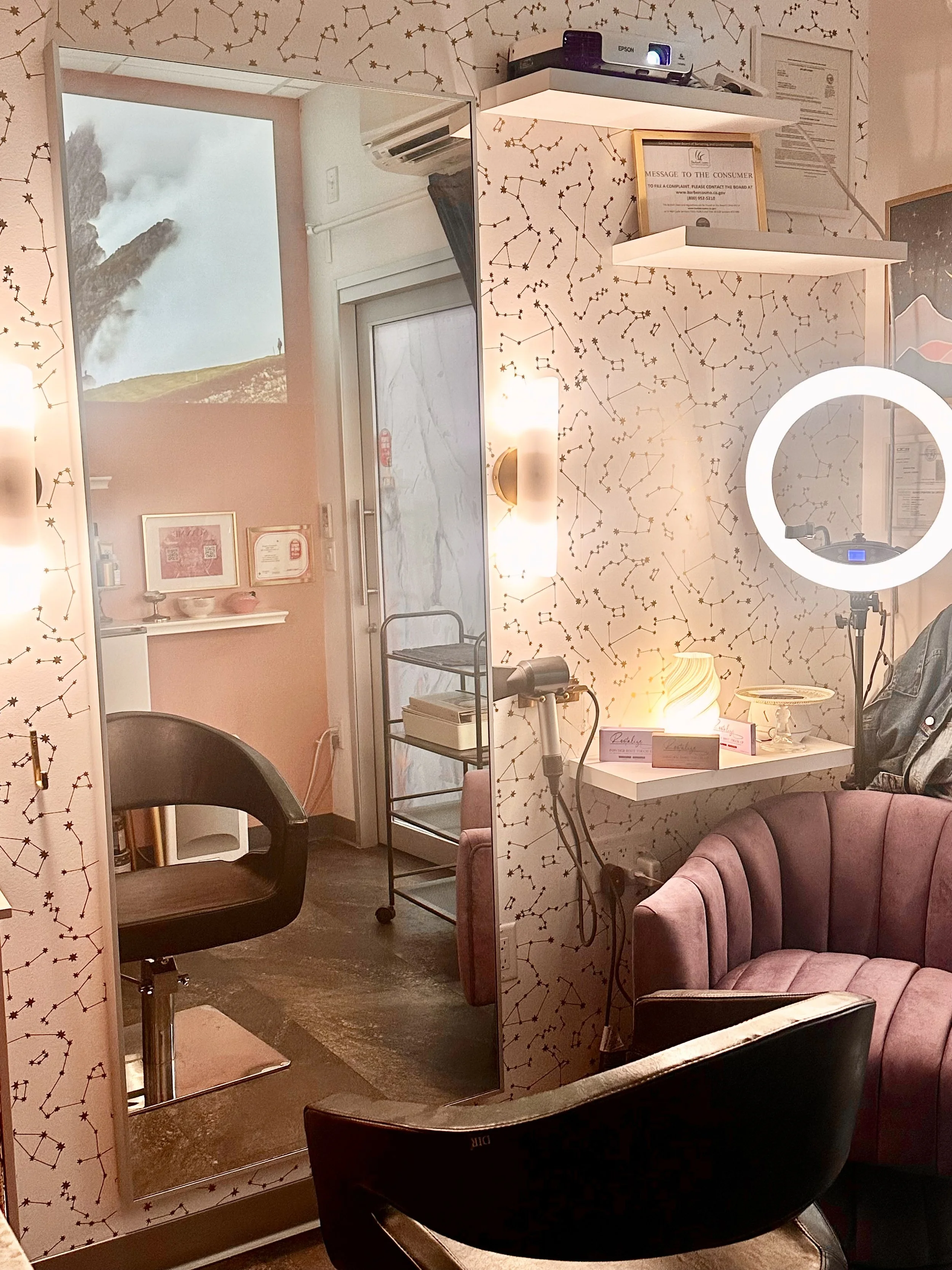 Beyond doing your hair, I’ve created an art-filled room that sets a vibe. As the artist, art and a moody aesthetic are what get me inspired to create and I want you to have an elevated experience in the process. My cozy salon suite offers a one-on-one experience with Lo-fi or chill jazz playing in the background and you are so welcome here.